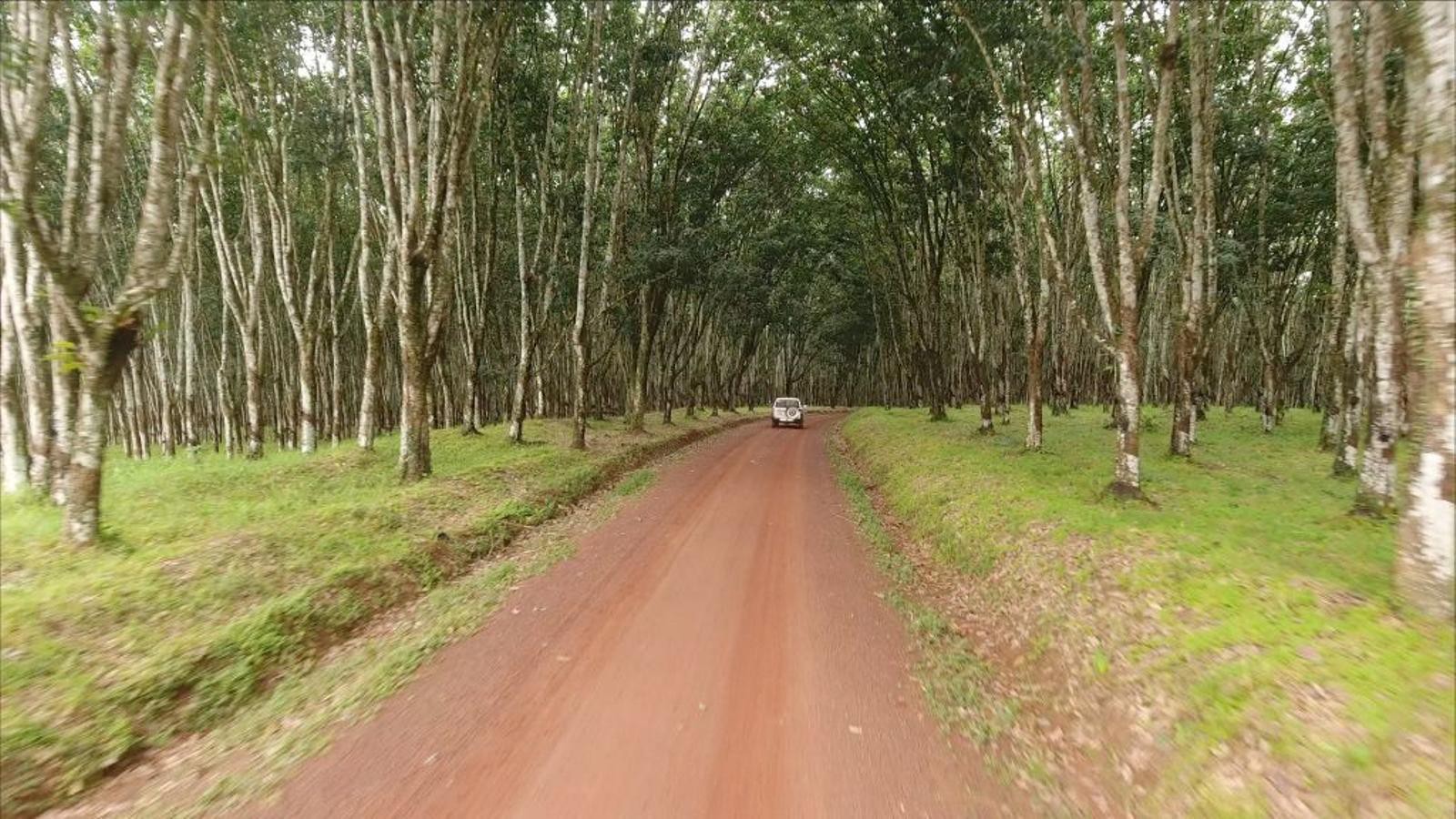 We pass through Liberia’s second largest rubber plantation. Owned by the Liberian Agriculture Company, it’s absolutely gorgeous. The trees are in perfect rows and have very thin trunks and branches. Only the tops of the trees have leaves, which form a delicate canopy. Each tree has a spout stuck into the trunk with a small cup to gather the dripping latex.